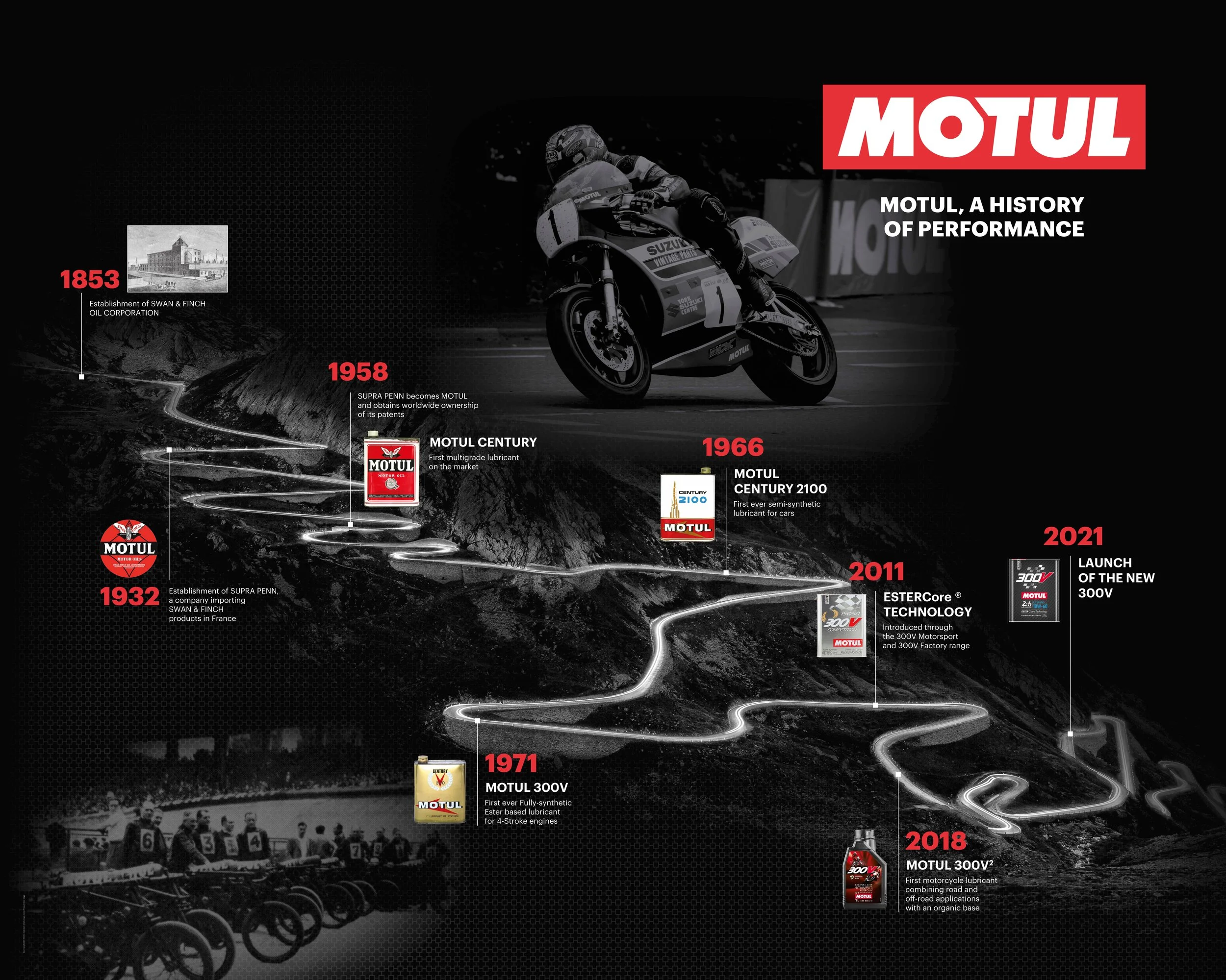 Founded in 1853, Motul is a French company with an international footprint specialized in the formulation, production, and distribution of high-performance lubricants for engines (two-wheelers, cars, heavy duty vehicles and more...), as well as for its industrial activity through its Motul Tech entity. Renowned for its capacity to innovate and to provide state-of-the-art synthetic lubricants, the brand launched in 1971 the very first 100% synthetic multigrade lubricant, its "flagship product": the Motul 300V.